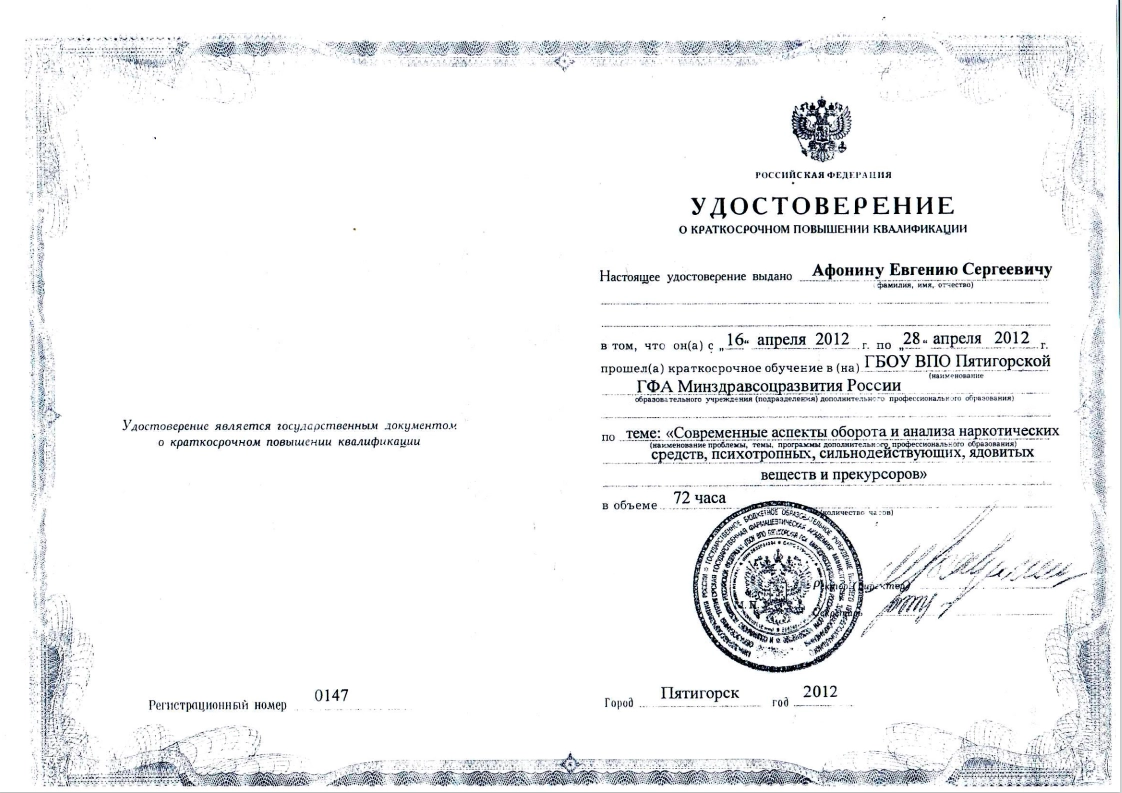 - 2012 г. Повышение квалификации по специальности "анестезиолог-реаниматолог", г. Пятигорск