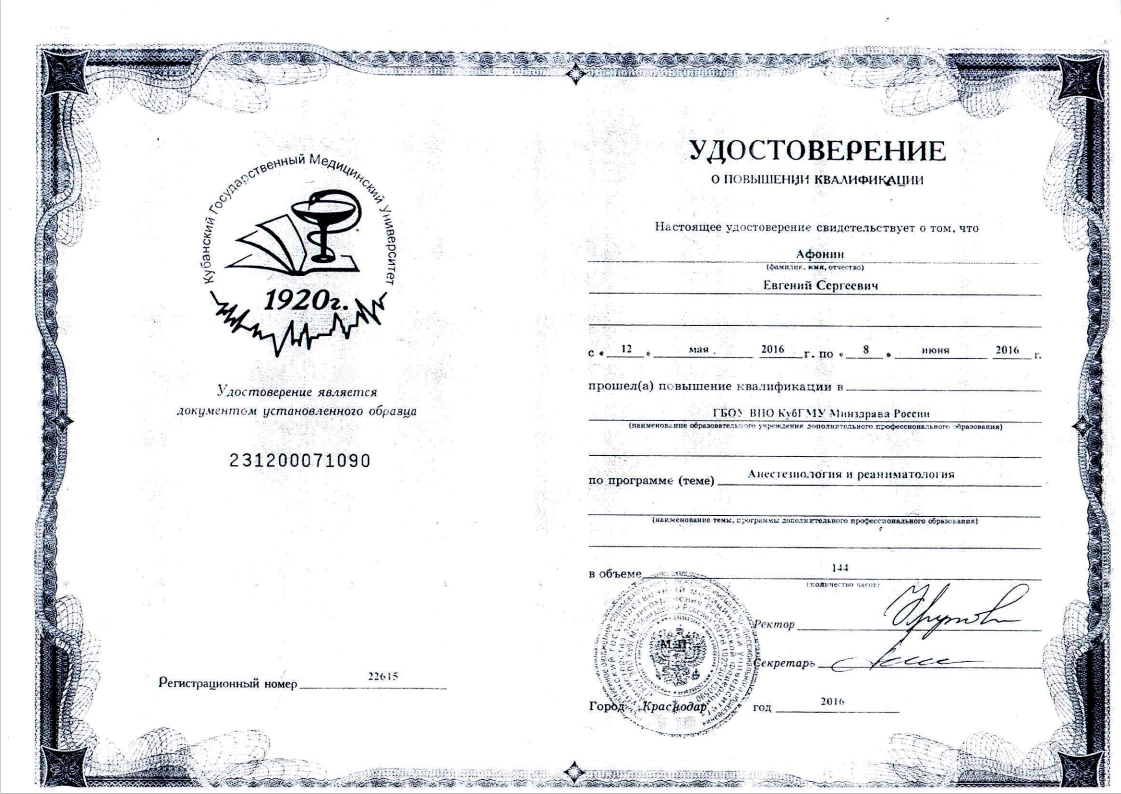 - 2016 г. КубГМУ - удостоверение о повышении квалификации по специальности "анестезиолог-реаниматолог"