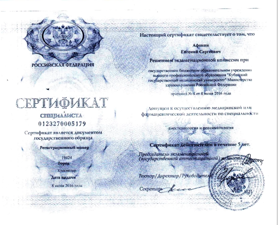 - 2016 г. КубГМУ - сертификат специалиста "анестезиолог-реаниматолог"